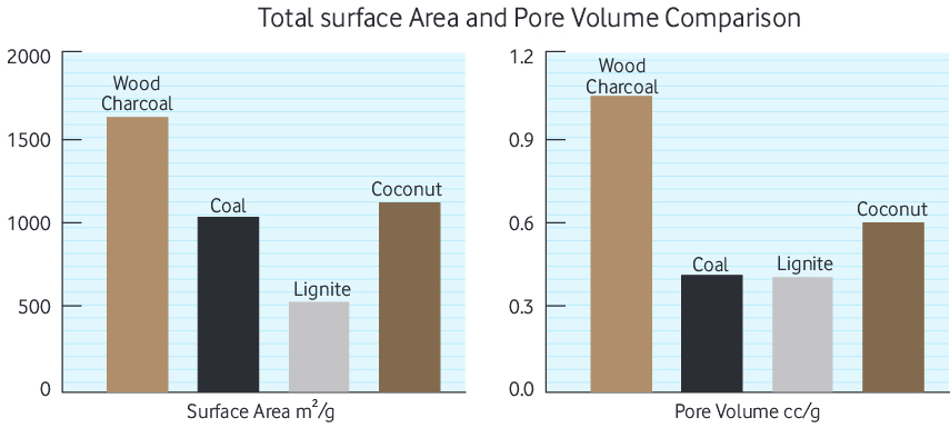Wood-charcoal based carbon delivers higher surface area and pore volume per gram than carbon from on other raw materials. The graph to the right shows wood-based carbon having two times the pore volume than carbon created from coal, lignite and coconut. This higher pore volume and surface area means your product will have higher purity in a shorter amount of time while using less carbonSurface & Pore